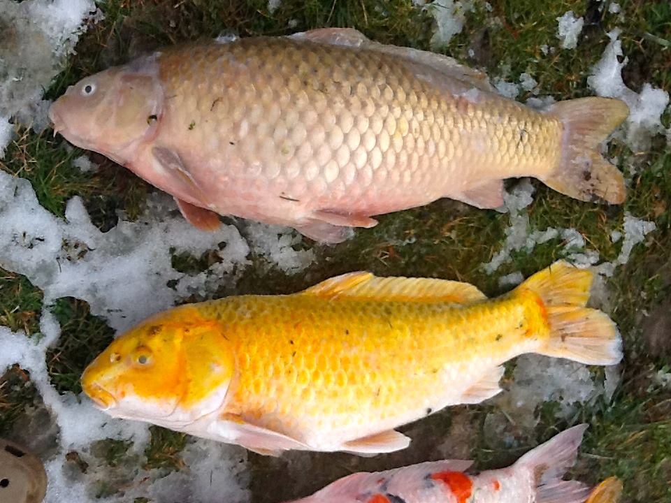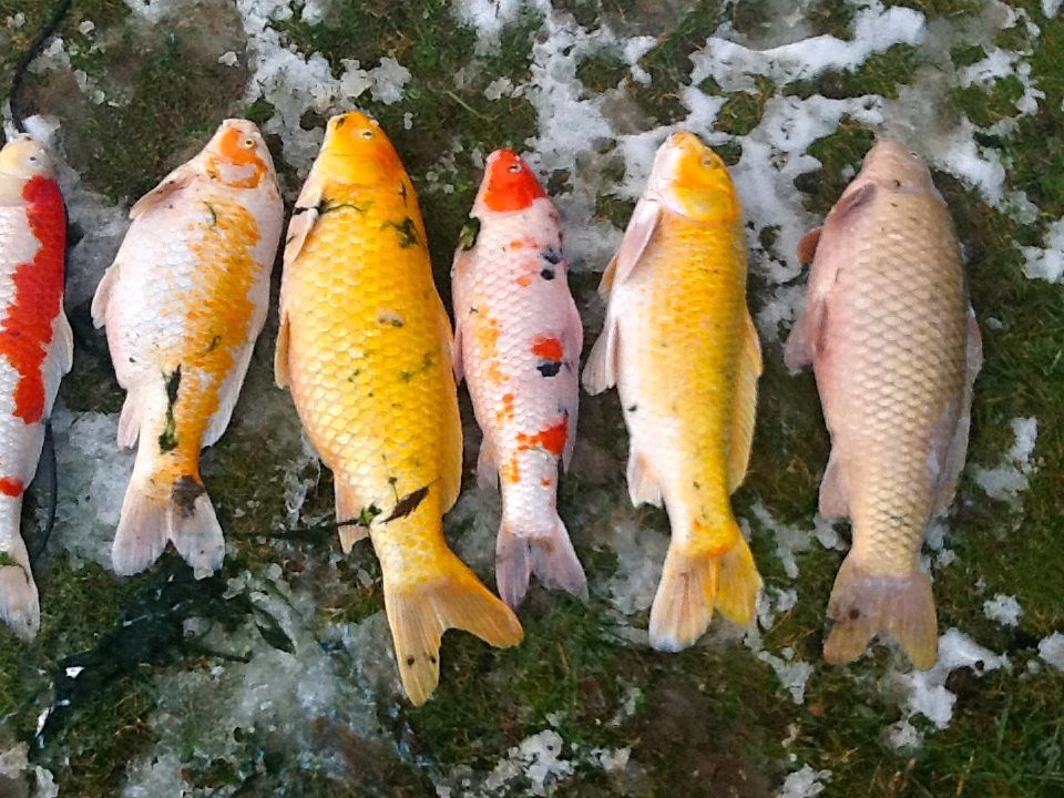 Гибель рыбы произошла из-за дефекта в системе фильтрации. Водоем с карпами НЕ подогревался зимой.