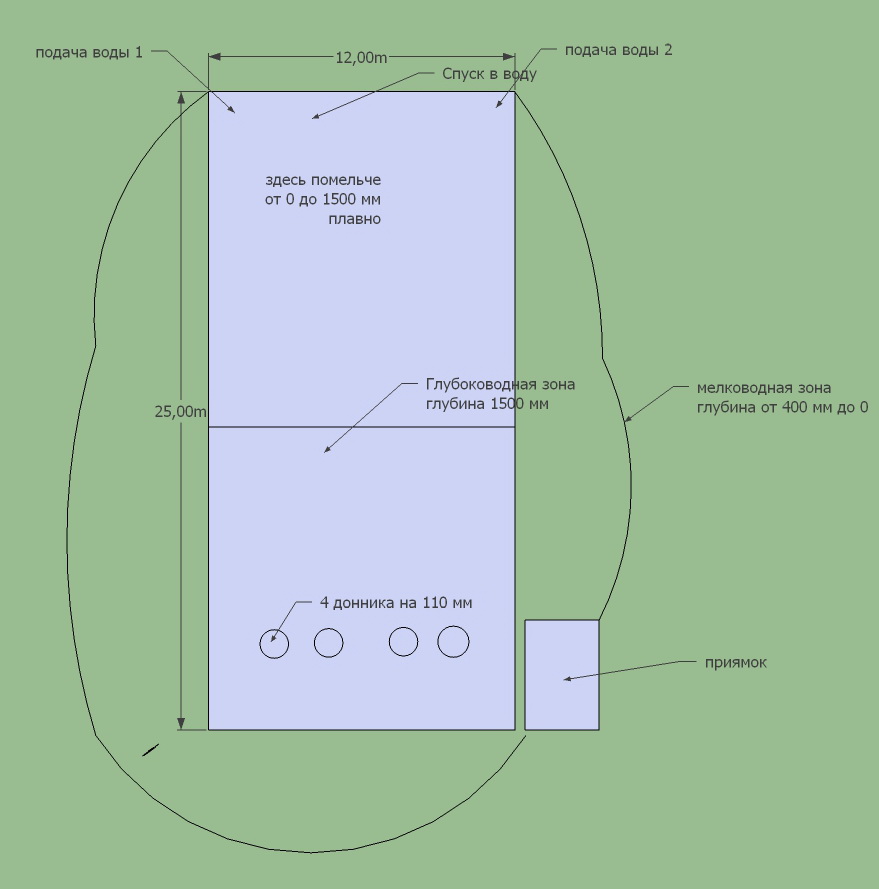 Подпорные стенки для глубоководной зоны залиты, закладные под трубы заложены, где-то через неделю приступим к укладке пленки EPDM, а также к монтажу оборудования. Для облегчения обслуживания данного водоема нами был заложен барабанный фильтр на 6 входов по 110 мм: 4 на донные заборы, а еще два на скиммера. Таким образом мы сможем забрать самотеком на очистку около 100 куб. метров воды в час. Часть воды будет сбрасываться обратно в водоем, а другая часть будет подаваться через 110 мм перфорированную трубу в зону регенерации. В проекте будут задействованы энергоэффективные насосы Blue Eco и Flowfriend, что позволит экономить около 15 000 Квт за сезон.